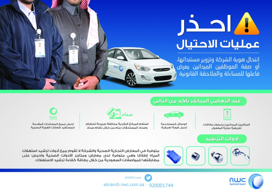 ودعت الشركة جميع عملائها إلى سرعة الإبلاغ عن أي تجاوزات غير مسؤولة فيما يخص التوصيلات المنزلية لخدمات المياه أو الصرف الصحي، أو تسويق أدوات الترشيد وبيعها، أو فرض غرامات، أو فحص العدادات، أو بيع المياه عبر الصهاريج من غير المرخص لهم، وذلك عبر قنوات الشركة الرسمية من خلال موقعها الرسمي (WWW.NWC.COM.SA)، أو الفرع الإلكتروني، أو مركز الاتصال الموحد (920001744)، أو التوجه إلى أحد مراكز خدمة العملاء، أو قنوات التواصل الاجتماعية التالية: (YouTube: NWCMediaTV)، (Instgram: @NWC_Media)، (Twitter: @nwc_media)، (Facebook: Facebook.com/nwcksa).