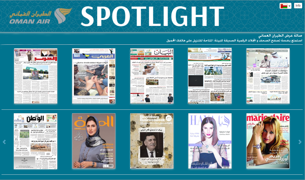 أعلن الطيران العُماني، الناقل الوطني لسلطنة عُمان، مؤخرا عن إطلاق نظام الوسائط الرقمية في قاعات الشركة المخصصة لضيوف الدرجات الممتازة بمطار مسقط الدولي. يأتي ذلك عبر تخصيص مكتبة وسائط رقمية "ميديا بوكس" والتي تعد واحدة من أضخم مكتبات الورق الإلكتروني وجرى تطويرها بواسطة خبراء مختصين من ميديا كاريير. ومن شأن هذه المبادرة أن تتيح لزبائن الطيران العماني القيام بتحميل باقاتهم الخاصة من المواد المقروءة عبر محفظة رقمية متكاملة من المجلات العالمية، بالإضافة إلى مجموعة واسعة من الصحف اليومية. تم كذلك توسيع محتوى صندوق الوسائط الرقمية ليشمل وسائل الإعلام المحلية والعربية في المنطقة بشكل حصري لضيوف الناقل الوطني للسلطنة؛ وذلك بالتعاون مع المجموعة المتحدة لخدمة وسائل الإعلام، وهي إحدى أكبر الشركات العاملة في مجال الإعلام ووسائل الاتصال في سلطنة عُمان ودولة الإمارات العربية المتحدة.