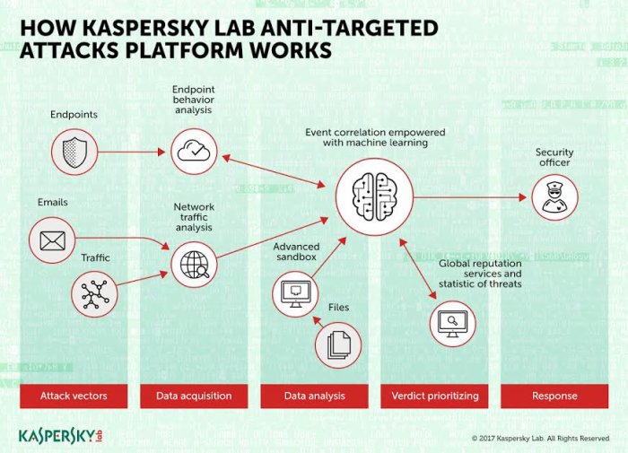 الكشف عن التهديدات. نظراً لكفاءتها المثبتة والعالية، نالت منصة كاسبرسكي لمكافحة الهجمات الموجهة " Kaspersky Anti Targeted Attack Platform" تقدير العملاء ومؤسسات الاختبار المستقلة. كما ساهمت التحديثات التي أدخلتها كاسبرسكي لاب على الحل للعام 2017 في رفع مستوى الأداء، وذلك من خلال إتاحة اندماج أفضل مع نقاط النهاية عن طريق حل أمن نقاط النهاية من كاسبرسكي لاب، أو ليكون حلاً قائماً بذاته لأمن نقاط النهاية، بحيث يساعد المستخدمين على اكتشاف أي سلوك مريب وطلب بيانات إضافية خلال عملية الإنجاز. وقامت كاسبرسكي لاب أيضاً بإضافة خاصية المسح "Scan" المستمر للكشف عن العناصر المريبة وإدراجها في أرشيف المعلومات. وهذا من شأنه ضمان الكشف عن الهجمات المخفية التي يتعذر رصدها بسهولة.