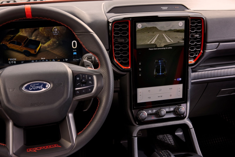 ويمتد التميز في خيارات التخصيص الفردية لرينجر رابتر إلى شاشة المعلومات الخاصة بالسائق قياس 12 بوصة، والتي يمكن تخصيصها بالكامل لتناسب مجموعة من أنماط القيادة. كما توفر الشاشة المركزية بقياس 12.8 بوصة رؤية محسّنة من خلال عرض صور متعددة للكاميرا، وتوفر قدرة أفضل على المناورة في المساحات الضيقة من خلال ميزات الرؤية بعين الطائر وكاميرا 360 درجة وعرض من الأعلى إلى الأسفل وعرض خطاف المقطورة الخلفية.
