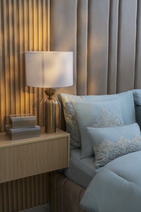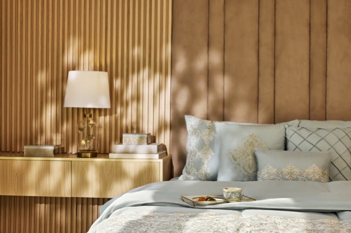 وتتضمن مجموعة الأدوات المنزلية توليفة من مفارش الأسرّة المميزة بتدرجات لونية فريدة مثل الأزرق الفاتح مع تصاميم فاخرة مزينة بزخارف ذهبية على الطراز الملكي. وتنسجم مفارش الأسرّة مع ستائر التول المتألقة بألوان مشرقة ومصابيح الطاولة الزجاجية المزينة بغطاء قماشي. وأضاف شهباز شيخ: "يغلب اللون الذهبي على مجموعة الأدوات المنزلية مما يجسد ألق المناسبة وأثره على ثقافتنا ومجتمعنا".