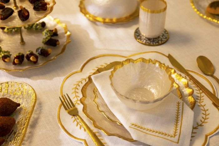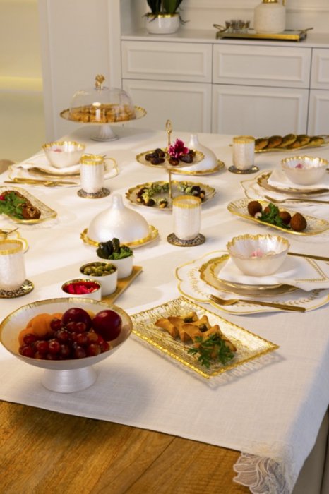وتتجلّى حرفية العلامة في أواني الطعام المبتكرة والتي تضم مجموعة من صواني التقديم وأدوات المائدة النحاسية، إلى جانب أواني الخزف المميزة باللون الأبيض العاجي مع حواف ذهبية. كما تضم التشكيلات صواني مزخرفة وأغطية أواني مميزة بهيكل زجاجي مصنوع بتقنية الطرق لتضفي لمسة راقية إلى وجبات الإفطار والسحور. وتتألق أطباق الخزف بطبعات ذهبية على شكل أوراق، مما يمنح الضيوف أجواء خاصة ومريحة تزخر بالتفاصيل الفاخرة.