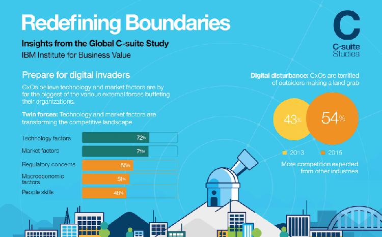 أشارت دراسة جديدة لشركة "أي بي أم" بعنوان "إعادة صياغة الحدود: رؤى من دراسة توجهات الرؤساء التنفيذيين حول العالم" إلى أن التحولات الجذرية الناجمة عن منافسين غير متوقعين باتت تشكل مصدر قلق كبير للرؤساء التنفيذيين في المنطقة؛ فخلال عامين فقـط، ارتفعت نسبة الرؤساء التنفيذيين العالميين الذين يتوقعون المنافسة من خارج القطاع من 43% في عام 2013 إلى 54% اليوم.