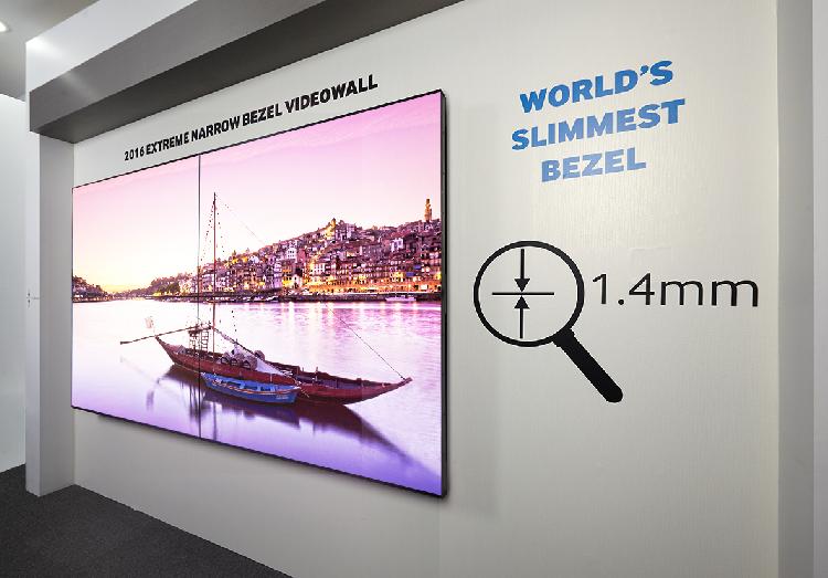 هذا وباستطاعة المتواجدين في معرض ISE 2016 أن يلقوا النظرة الأولى على أنحف شاشة حائط بتقنية Video Wall. إذ تتميز شاشة سامسونج UHF-E، بتصميم ذو إطار نحيل (تبلغ نحافة الجانبين العلوي والأيسر نحو 0.9 مم، بينما نحافة الجانب السفلي والأيمن بلغت 0.5 مم) لتبقي المشاهدين مركزين في محتوى الشاشة بدلاً من الشاشة نفسها. وبكونها مجهّزة بنفس الصلابة ومكونات عرض اللون كما سابقاتها، فإن شاشة الفيديو الجدارية UHF-E تعطي بديلاً أنيق وعصري لتقديم محتوى دون انقطاع في معظم البيئات المغلقة.