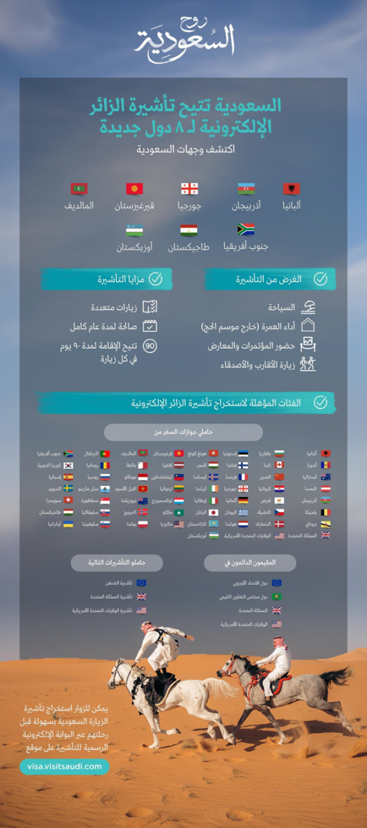 ويتيح القرار لحاملي جنسية الدول الـ 8، التقدم بطلب تأشيرة الزيارة إلى المملكة إلكترونيًا، أو طلبها عند الوصول إلى أحد المنافذ الدولية للمملكة.
