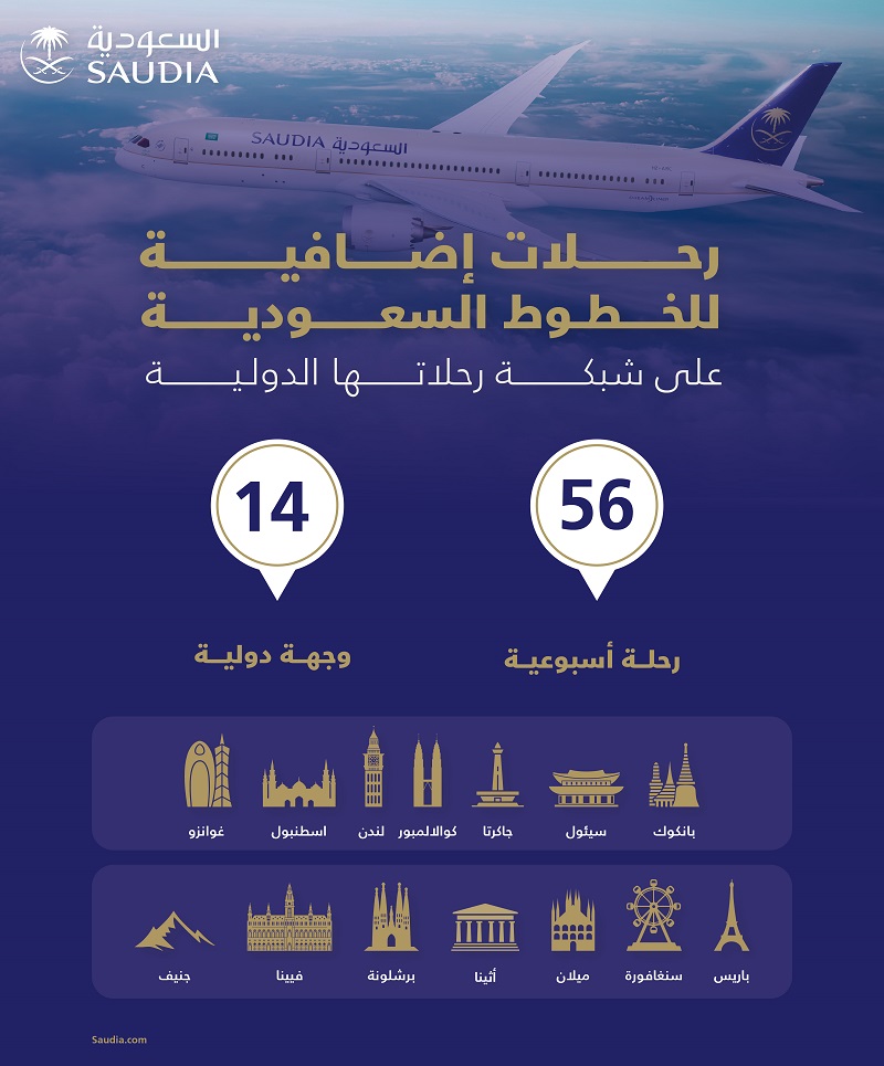 أضافت الخطوط السعودية (56) رحلة دولية لعدد من وجهاتها الدولية تفعيلاً لاستراتيجيتها بجلب العالم إلى المملكة إلى جانب تعزيز تواجدها الدولي بزيادة حصتها التسويقية وبخاصةٍ المحطات التي تشهد كثافة في حركة السفر، حيث تهدف "السعودية" من التحديث المستمر لجدولة رحلاتها وعملياتها التشغيلية إلى تلبية رغبات الضيوف وتوفير الأوقات المناسبة لسفرهم على مدار العام وفي مواسم الذروة.