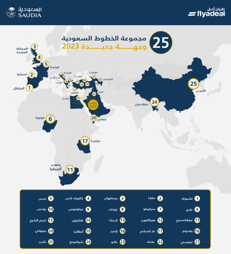 تدشن مجموعة الخطوط السعودية خلال العام الحالي 2023م (25) وجهة دولية جديدة في (3) قارات حول العالم، حيث ستشغل رحلاتها إلى كل من بكين في جمهورية الصين الشعبية، برمنغهام بالمملكة المتحدة، دار السلام في تنزانيا، تشيتاغونغ في بنغلاديش، جمهورية جيبوتي، لشبونة عاصمة البرتغال، كانو في نيجيريا، بغداد عاصمة العراق، مطار غاتويك في لندن، نيس بفرنسا، ملقا بإسبانيا، ميكونوس باليونان، جوهانسبرغ بجنوب أفريقيا، شرم الشيخ في جمهورية مصر العربية، تبليسي عاصمة جورجيا، باكو عاصمة أذربيجان، طرابزون وأنطاليا وبودروم وإزمير في تركيا، سراييفو عاصمة البوسنة والهرسك، هيراكليون ورودس في اليونان، لارنكا في جمهورية قبرص، وتيفات في جمهورية الجبل الأسود، وذلك بهدف تعزيز موقعها التنافسي على القطاع الدولي بالاستثمار في إمكاناتها التشغيلية والمتمثلة في توفر أسطول جوي حديث يفي بالمتطلبات التشغيلية الحالية والتوسع المستقبلي، حيث أعلنت مع شركة "بوينج" قبل أيام عن صفقة تتضمن زيادة أسطول الطائرات عريضة البدن بعدد (39) طائرة جديدة من طراز بوينج (B787) دريملاينر مع خيار إضافة (10) طائرات أخرى.
