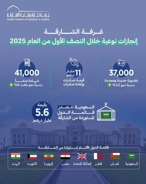 وأظهرت بيانات شهادات المنشأ الصادرة عن غرفة الشارقة خلال النصف الأول من العام الحالي تصدّر المملكة العربية السعودية قائمة الدول المستوردة من الشارقة حيث بلغت قيمة الصادرات وإعادة الصادرات إليها أكثر من 5.9 مليار درهم ما يعكس قوة العلاقات التجارية بين الجانبين ومكانة الشارقة كمورد رئيسي للأسواق الخليجية. وجاءت سلطنة عمان في المرتبة الثانية بقيمة تجاوزت 1.6 مليار درهم تلتها العراق بقيمة تجاوزت 1.5 مليار درهم فيما شملت قائمة أبرز الأسواق التصديرية كل من قطر والمملكة المتحدة ومصر وإثيوبيا والكويت والهند.