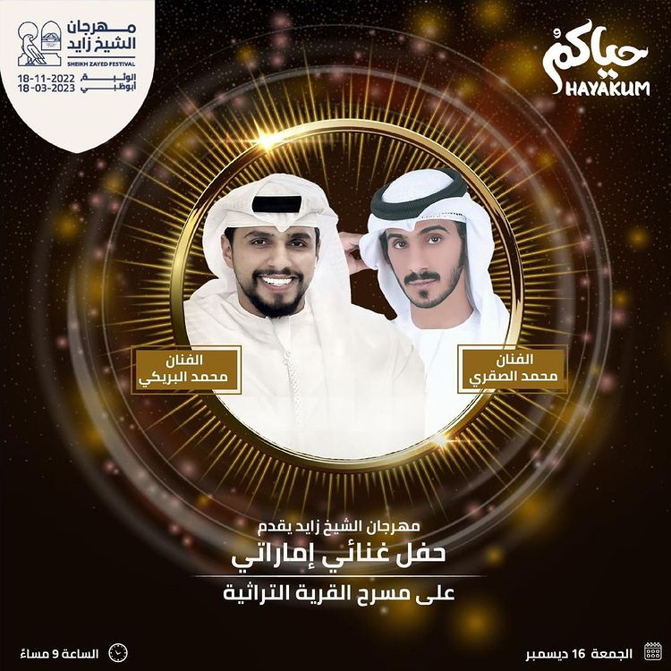 :يستضيف مهرجان الشيخ زايد يوم الجمعة المقبل 16 ديسمبر 2022، حفلاً غنائياً يجمع الفنانين الإماراتيين محمد البريكي ومحمد الصقري في ليلة ساهرة من ليالي المهرجان على مسرح القرية التراثية في تمام الساعة التاسعة مساء حيث يقدمان للجمهور مجموعة من أشهر أغانيهما.