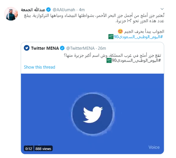 وعلى ضوء الاحتفال بالعيد التسعين للمملكة، ومع اختلاف طريقة احتفال الناس في ظل الظروف الحالية، أطلق تويتر اختبارًا سريعًا مدته 90 دقيقة عبر حسابه في منطقة الشرق الأوسط وشمال أفريقيا @TwitterMENA حول معلومات متنوعة عن المملكة ابتداء من لحظات التاريخية أو أطعمة شعبية، أو في أماكن مميزة غير معروفة وصولاً إلى الرياضة.