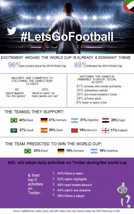 ووفقاً لدراسة حديثة أجرتها منصة تويتر، أبدى 97٪ من المستخدمين في المملكة العربية السعودية حماسهم لمتابعة بطولة كأس العالم 2018، حيث خطط 43٪ لمشاهدة جميع المباريات، بينما يخطط 92٪ لاستخدام تويتر كمنصة رئيسة للأنشطة اليومية خلال نفس المدة.