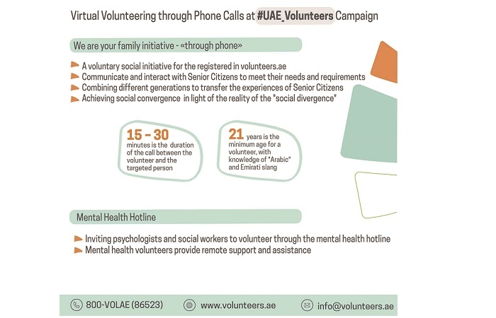 ودعت سعادة المتحدث الرسمي عن حملة الإمارات تتطوع أصحاب الاختصاص من المرشدين والأخصائيين النفسيين والاجتماعيين من مختلف الجنسيات المقيمة في دولة الإمارات إلى المبادرة في التسجيل كمتطوعين لتحقيق مستهدفات "الخط الساخن للصحة النفسية" وهي مبادرة يجري تنفيذها من خلال خط ساخن مجاني على مدار الساعة طوال أيام الأسبوع لدعم الذين يطلبون المساعدة على مستوى دولة الإمارات ويتم تشغيل الخدمة من قبل متطوعي الصحة النفسية الذين يعملون عن بعد - في أي مكان مع جهاز حاسب آلي واتصال آمن بالإنترنت.