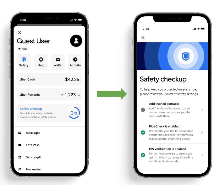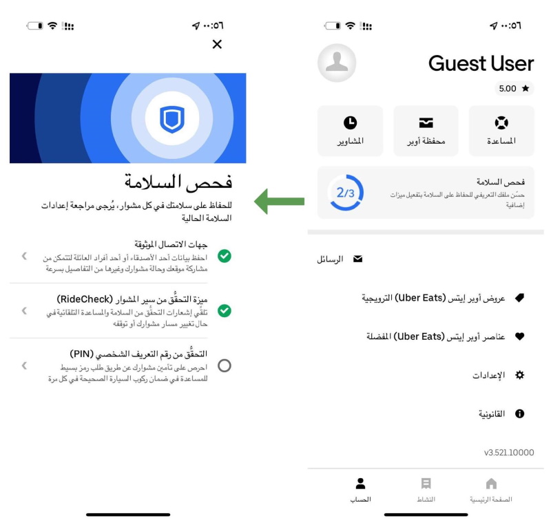 في خطوة رائدة في النقل التشاركي، تساعد خاصية الاطمئنان على سلامة الركاب على إكمال الملف التعريفي الخاص بالسلامة في التطبيق عن طريق تشغيل واستخدام خصائص 'إضافة جهات الاتصال الموثوقة' و 'التحقق عن طريق رقم التعريف الشخصي' و 'التحقق من الرحلة' المتوفرة داخل التطبيق. تم تصميم كل هذه الخصائص لتحسين أمان مستخدمي منصة أوبر: