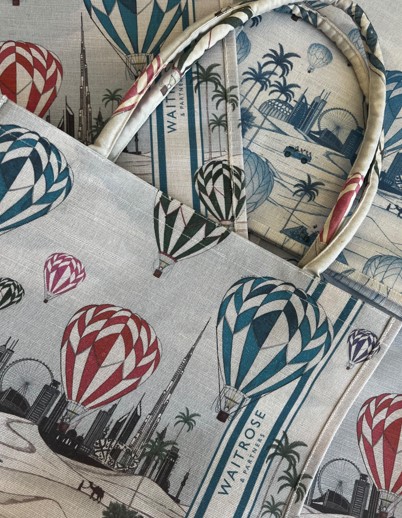 وتكريماً لوطن تتلاقى فيه التقاليد الثقافية الغنية مع الحداثة والطموح، يتم تصنيع الأكياس الأنيقة من مواد صديقة للبيئة، تمزج بين الخيش والقطن لابتكار شنطة تسوق عصرية وعملية يمكن حملها بسهولة. وتُظهر الرسومات التصويرية المعبّرة مناطيد هوائية بخلفية آسرة لمعالم شهيرة مثل برج خليفة، ومتحف المستقبل، بالإضافة إلى الكثبان الرملية المتعرجة لدولة الإمارات، حيث يمكن رؤية عائلة إماراتية في نزهة، بينما تسير قافلة من الجمال، وسيارة لاندروفر عتيقة تنطلق في رحلة استكشافية من مسافة بعيدة.