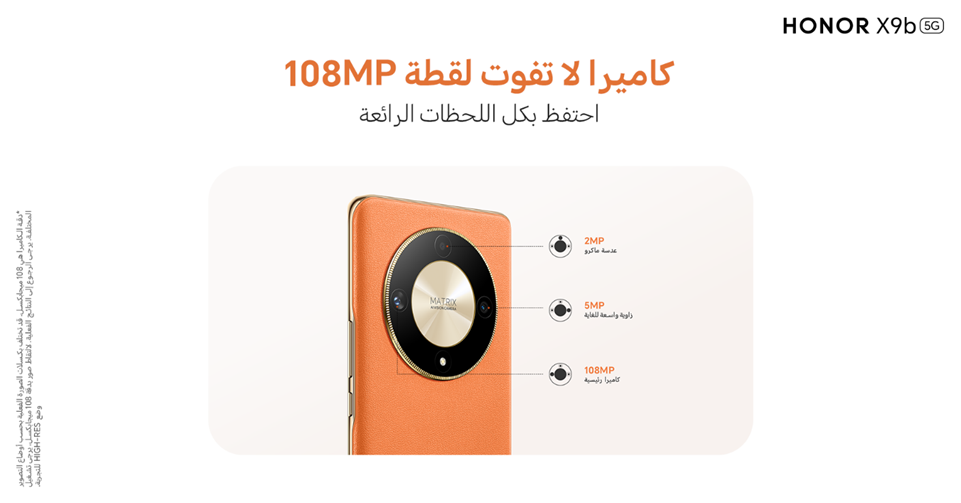 يوفر هاتف HONOR X9b 5G للمستخدمين تجربة تصوير احترافية لالتقاط أجمل اللحظات بأدق التفاصيل مع نظام الكاميرا ثلاثي العدسات، والتي تشمل كاميرا رئيسية بدقة 108 ميجابكسل، وكاميرا فائقة الاتساع بدقة 5 ميجابكسل، وكاميرا ماكرو بدقة 2 ميجابكسل، والتي تتيح للمستخدمين التقاط الصور والفيديوهات بدقة عالية حتى في الأماكن منخفضة الإضاءة. ويأتي نظام الكاميرا مزوداً بمجموعة من التقنيات مثل تقنية التقاط الأشياء سريعة الحركة بكفاءة عالية، مع خاصية التقريب حتى 3X لضمان وضوح التفاصيل وجودة الصورة.