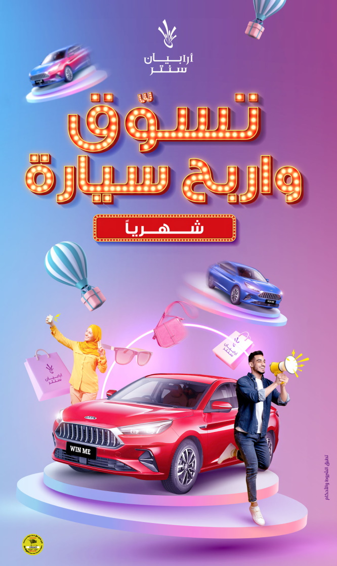 من خلال عرض ترويجي لمدة شهرين، يحظى المتسوقين داخل أرابيان سنتر بفرص ربح سيارة كل شهر عندما يتسوقون بمقابل 200 درهم أو أكثر.