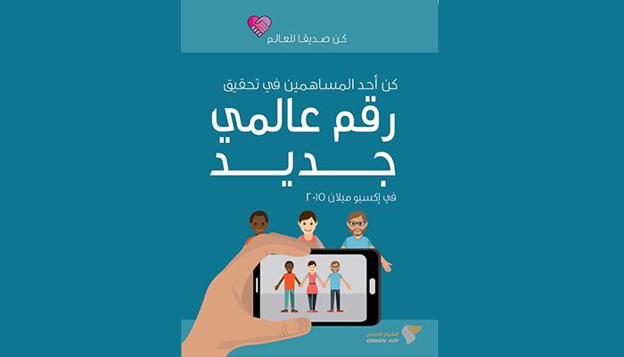 ويسعى الطيران العماني لتسجيل الرقم القياسي في موسوعة جينيس من خلال مجموعة كبيرة من الصور تنشر على صفحات الشبكة العنكبوتية العالمية لسلسة من البشر وهم متماسكي الأيدي، حيث يهدف لنشر أكثر من عشرة آلاف صورة لأشخاص من مختلف أنحاء العالم بحلول نهاية أكتوبر 2015.