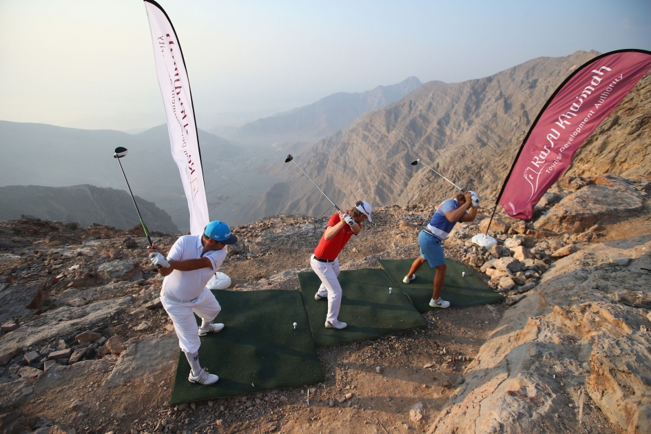A trio of contenders in this week’s inaugural Ras Al Khaimah 2016 Golf Challenge have experienced ‘High Tee’ with a difference, as they scaled the towering Jebel Jais, the UAE’s highest mountain, before firing a series of blistering drives into the rocky caverns of the lunar-like landscape of the Al Hajar mountains.