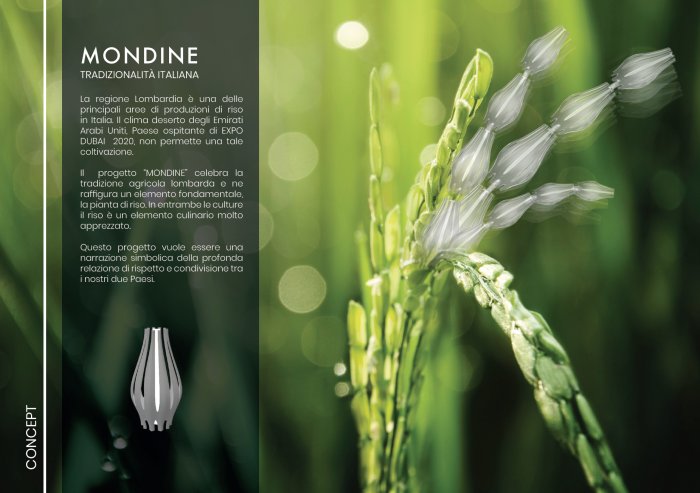 “Each base of the installation houses three semi-rigid structures cradled by the wind. At sunset, these ‘ears’ will be internally lit, acting as kinetic sculptures, lighting fixtures and way-finding elements. The lighting of the three structures is powered by a LED RGB, which, depending on the type of the function performed, can take on a different color. MONDINE will stand tall in Expo 2020 to greet its visitors and share its story,” she said.