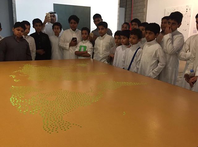 During their visit to the exhibition, students were welcomed by a group of trained male and female guides who accompanied them through the tour. Transportation and meals were provided by the Saudi Art Council.