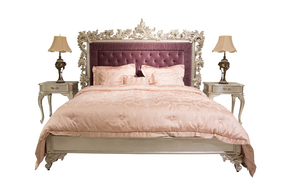 Intricately hand carved from solid mahogany wood complemented by the tufted velvet headboard, is the splendid Victor silver bed. The hand-carved detail is enhanced by the ultimate glamorous antique silver leaf finish. With its elaborate carvings reflecting the love of art and luxury.