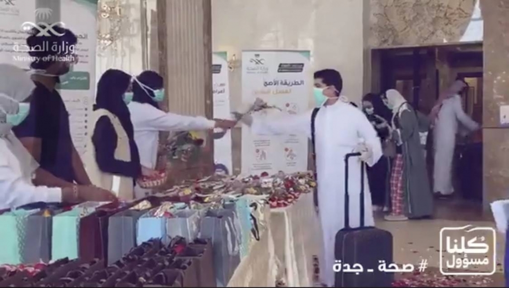 Videos posted online by the Ministry showed medical staff bidding farewell to the citizens by giving them roses and gifts while they left a 5-star hotel for their homes after 14 days.