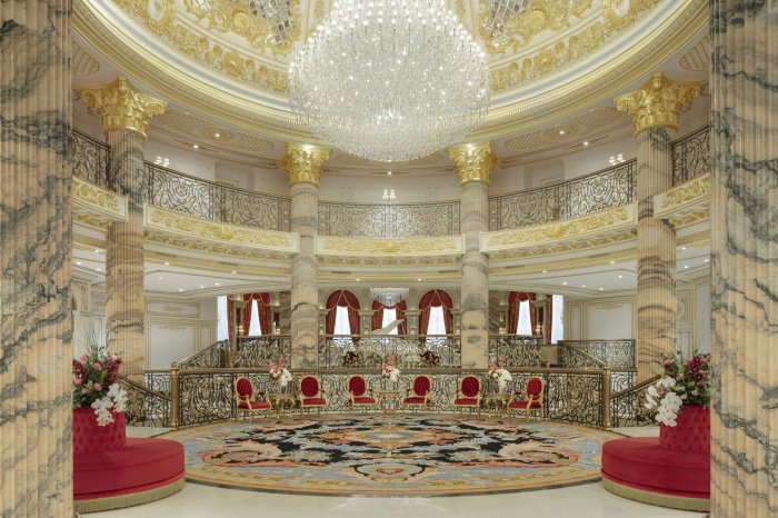Standing proudly on the west crescent of Palm Jumeirah, Emerald Palace Kempinski Dubai is an architectural masterpiece created with unrestrained splendour. This resort is a 100,000 square metre Palace that has been designed for the privileged few to enjoy all the facilities of a modern-day luxury hotel at their fingertips, including a private beach, magnificent spa, personalised service and delightful cuisine. Created to awe guests by the extraordinary interiors, the resort boasts 40,000 Swarovski crystals shimmering in a stunning chandelier surrounded by intricate gold leaf and exquisite mirrors. Everything in the resort highlights grandeur, from hand-woven damask silk tapestries and polished rose-hued Rosa Portogallo marble columns to the 6,400 Bohemian and Moravian crystal chandeliers and the handcrafted white and gold leaf Blüthner Supreme Edition Louis XIV grand piano which graces the lobby lounge, Blüthner Hall.