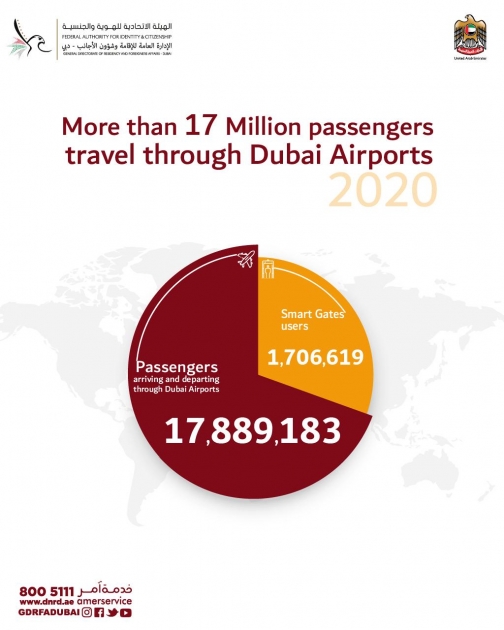The General Directorate of Residency and Foreigners Affairs in Dubai has revealed that the number of passengers traveling through Dubai airports during the past year was 17 million and 889 thousand and 183 passengers, while smart gates’ user exceeded the one million mark with 706 thousand and 619 passengers.