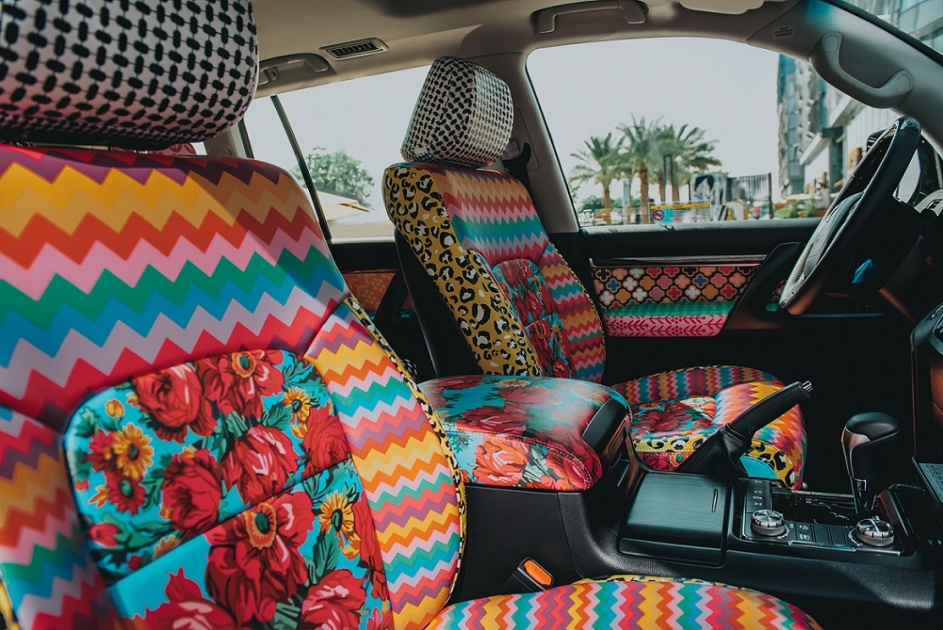 The special edition Land Cruiser art piece boasts vibrant colours with artistic flair throughout. From the outside, colourful flowery designs have been added on the wheel arches of the SUV. The interior cabin has been revamped to give the look and feel of an Emirati majlis yet showcasing the patterns and colours in a way that give it a modern touch. From multi-colour patterns on the leather seats to autographed floor mats, the driver and passenger will experience comfort as well as style.