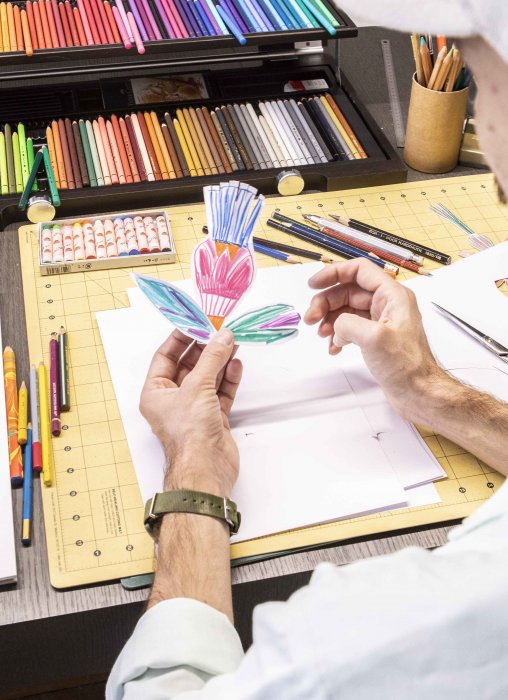 The project focuses on the theme of flowers – a subject you are not usually associated with. What attracted you to it? I have been drawing vases for several years: I say they are like actors on a stage, elements in a theater production. But people often point out that there are never any flowers in my vases. So I thought it was funny and interesting that – when we met – the Maison invited me to draw some, leaving a lot of room for the energy of color. The idea was to present flowers in bloom, but also the colors that come to life. My palette is already rich, but I really expanded it to create drawings that are both a personal signature and the fruit of this collaboration with Van Cleef & Arpels. It’s a dialogue, an exchange, a conversation .