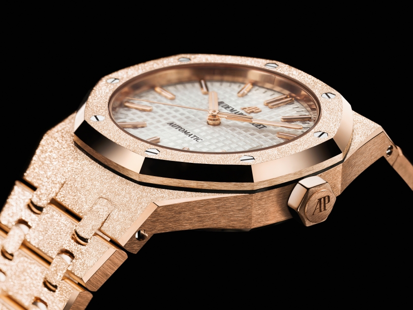 The launch of the Royal Oak Frosted Gold enriches Audemars Piguet’s tradition of experimenting with jewellery techniques. The defining feature of the Royal Oak Frosted Gold resides in its shimmering sparkle, which in turn comes from a surface treatment process rooted in an ancient gold hammering technique, also called the Florentine technique. Carolina Bucci has reinterpreted this technique in jewellery design today while Audemars Piguet’s experts developed it into a horological craft suited to the unique case and bracelet construction of the Royal Oak.