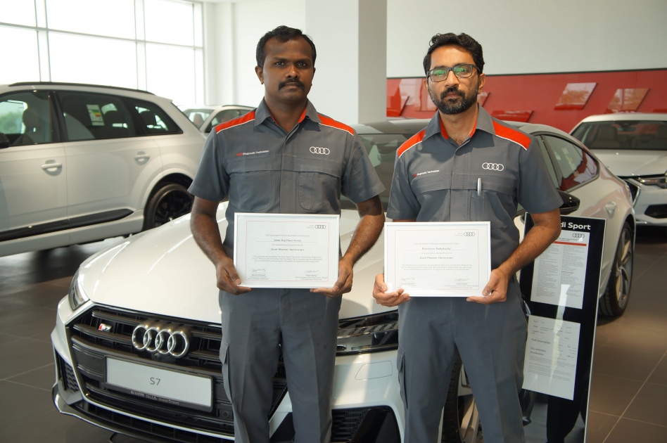 Audi Abu Dhabi and Al Ain team members Jeba Durai and Binumon Babykutty, who have been with the company for seven and eight years respectively, were awarded Master Technician status following the completion of the rigorous training program and related examinations, based on the global network standards, via the AVME Training academy in Dubai.