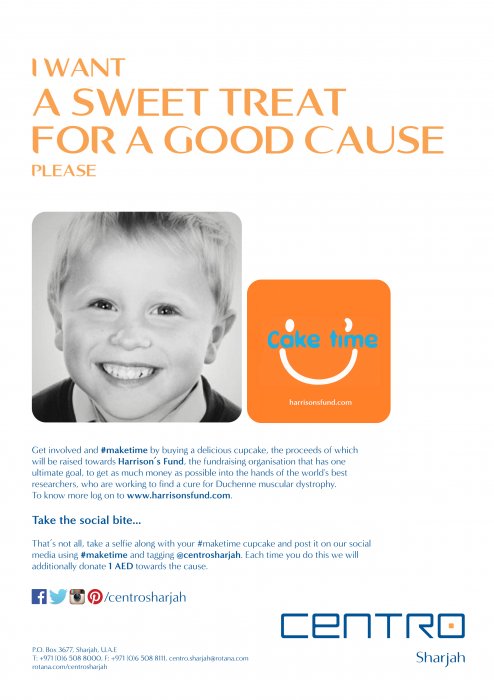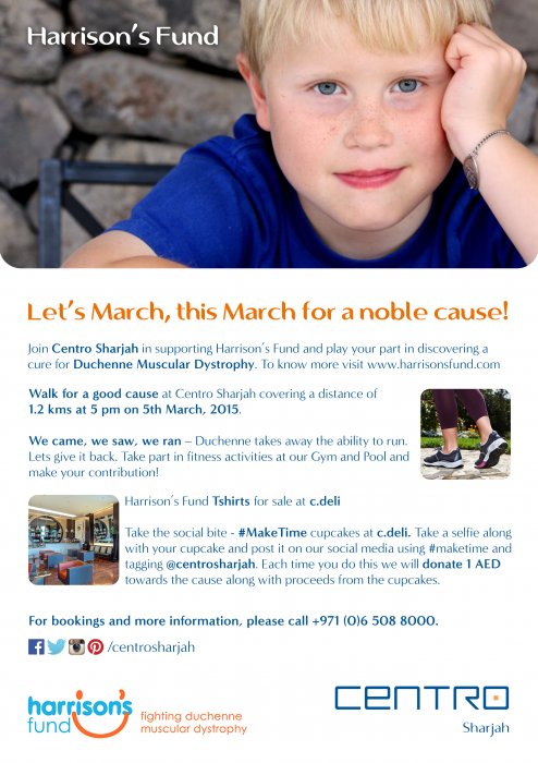 As we continue to chart our way into the year, Centro Sharjah is dedicating this month towards supporting Harrison’s Fund, the fundraising organisation that has one goal, to get as much money as possible into the hands of the world's best researchers, who are working to find a cure for Duchenne. To know further Log on to www.harrisonsfund.com Harrison’s Fund is named after the son of Alex and Donna Smith who was diagnosed with Duchenne Muscular Dystrophy which is an X-linked disease that affects 1 in every 2400 boys approximately, worldwide. Most patients are diagnosed at approximately 5 years of age, when their physical ability diverges markedly from that of their peers. Their muscle strength deteriorates, and boys require the use of a wheelchair before their teens. Respiratory, orthopedic, and cardiac complications emerge, and without intervention, the mean age at death is around 19 years. “Centro Sharjah will continue to extend its long drawn support towards the noble cause and like last year we hope to make a valuable contribution” said Michael Kasch, General Manager. “This year we’ve chalked down exciting activities which will be underway at the hotel site, collectively involving guests and colleagues to create awareness” he explained. Let’s march this march towards a noble cause: Save the date 5th March, 2015 at 5 PM Guests and colleagues collectively, will be participating in a walkathon around Centro Sharjah covering a distance of 1.2 Km; Each participant will make a valuable contribution in the end. Here’s a link to the Facebook event – https://www.facebook.com/events/1571495406427416/ Harrison’s fund Tshirts for sale: You can now buy specially made T Shirts to wear for the walkathon at c.deli, our around the clock delicatessen Veni, Vidi, Cucurri - we came, we saw, we ran Duchenne takes away the chance to run, let’s help give it back #maketime. For the whole of March each time you run, cycle or swim in our recreation premises you can contribute by clocking your distance covered and making your donation. Take the Social bite We are selling #maketime cupcakes at c.deli, our around the clock delicatessen. Click a selfie along with your dessert on social media and use #maketime and tag @centrosharjah. Each time you do this we will donate 1 AED towards the cause above the money contributed through your cupcakes purchased. Get involved by connecting with us on – • https://www.facebook.com/CentroSharjahHotel • https://twitter.com/CentroSharjah • https://instagram.com/centrosharjah/ • http://roho.it/rttys