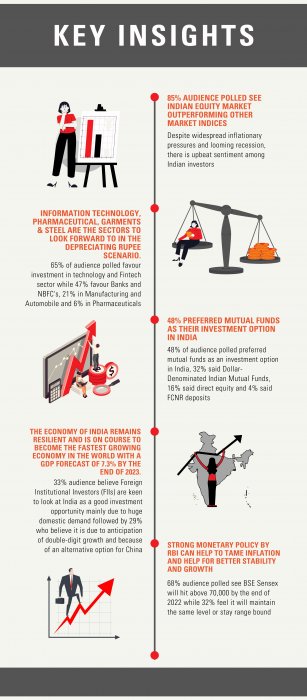 India’s unique position in the global value chain, its demographic dividend, and huge domestic demand, combined with externalities such as the China-Taiwan standoffs and the Ukraine-Russia conflict, are being increasingly factored in by global experts and research bodies in their economic forecasts. Despite widespread inflationary pressures and looming recession, there is upbeat sentiment among Indian investors, as evident from the audience poll (Webinar and LinkedIn channels), where 75% of respondents voiced confidence in Indian equity markets outperforming global indices.