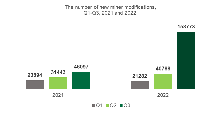 In fact, 2022 saw a sharp increase in the number of new modifications to malicious mining programs. During the first three quarters of 2022, expert analysis identified 215 843 new miners, more than twice as many as last year.