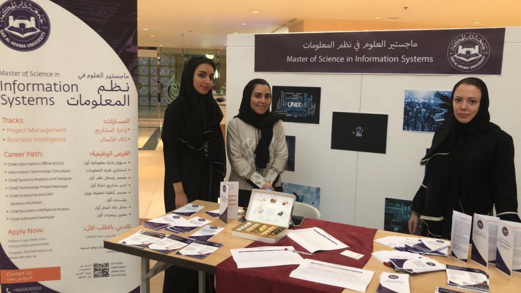 The number of prospective students who wanted to get an idea about theundergraduate programs exceeded 50 while that of prospective students seekinginformation about the master programs exceeded 70. Dar Al-Hekma offers various masterprograms for female students and has recently opened admission for men interested in its master programs.