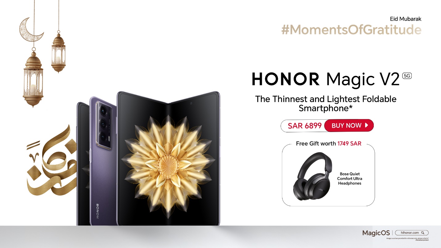 HONOR Magic V2 comes at a special price of SAR 6899 with free Bose Quiet Comfort Ultra Headphones during Eid offers.