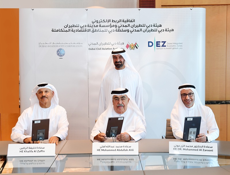 In the presence of H.H. Sheikh Ahmed bin Saeed Al Maktoum, Chairman of Dubai Civil Aviation Authority, and Chairman and Chief Executive of Emirates Airline and Group, two significant agreements have been signed. The first agreement was a partnership focused on the integrated link between the Dubai Civil Aviation Authority and Dubai Aviation City Corporation, and the latter was signed for the same purpose between the Dubai Civil Aviation Authority and the Dubai Integrated Economic Zones Authority. These agreements aim to foster enhanced cooperation and integrated link using ‘Web Service’ technology for issuing commercial activity permits in the aviation sector, thereby enabling immediate approvals from DCAA for commercial licensing transactions in the Al Maktoum International Airport and Dubai Airport Freezone. It also strengthens institutional information and data management cooperation, facilitating systematic integration.