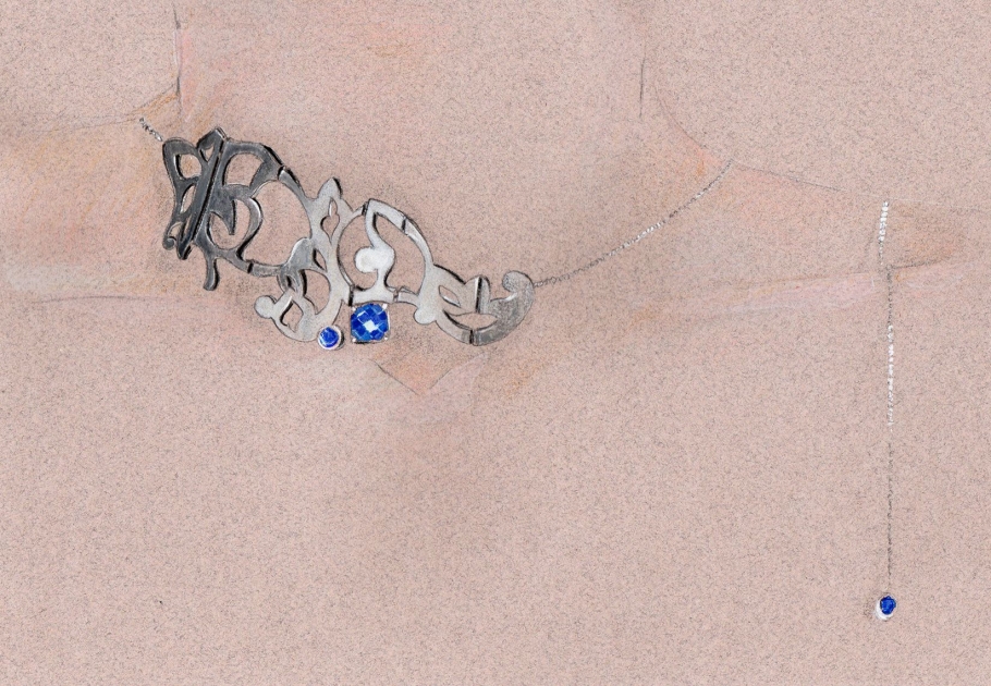 “Paria Garshasbi, on the other hand, used gold to create lines, flowing down from the choker like a waterfall with water sparkles depicted by precious stones, giving it both dazzling and calming effect.”