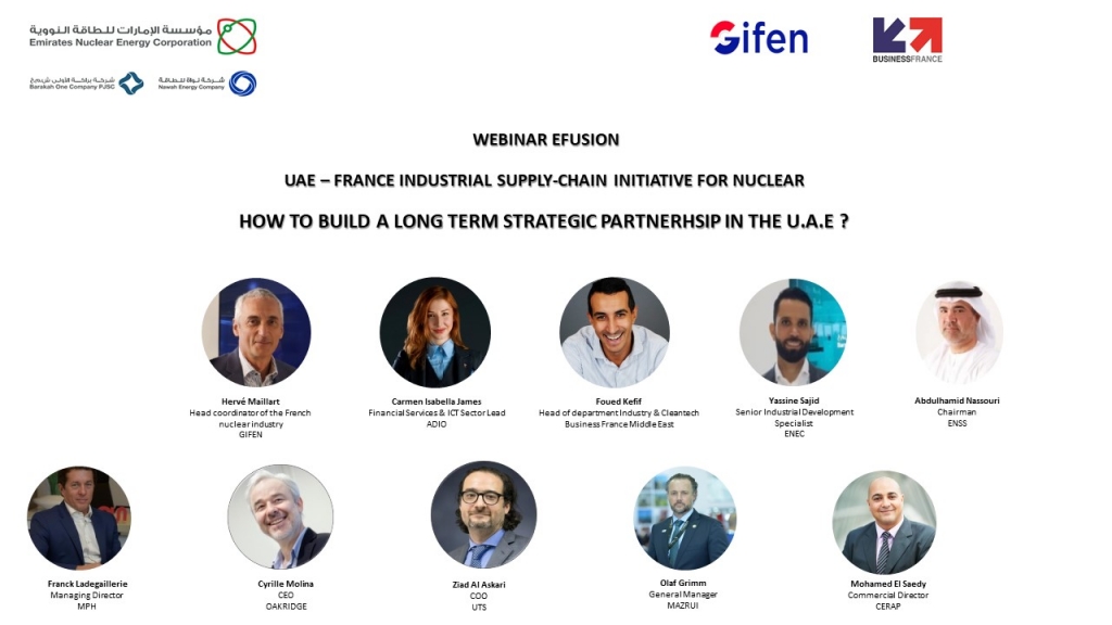 In the framework of E-fusion live event, the UAE-France Industrial Supply Chain Initiative for Nuclear was held virtually and gathered more than 50 companies from France and the United Arab Emirates (UAE), highlighting the opportunities to support the local nuclear industry , and hear testimonials from local companies on the keys to building successful partnerships between the UAE and French companies.