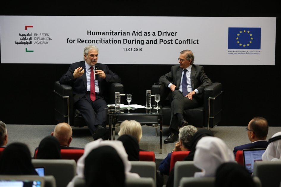 The Emirates Diplomatic Academy (EDA), the UAE’s leading international relations and diplomatic institution, held an interactive discussion with His Excellency Christos Stylianides, European Commissioner for Humanitarian Aid and Crisis Management, on ‘Humanitarian Aid as a Driver for Reconciliation during and after Conflict’.