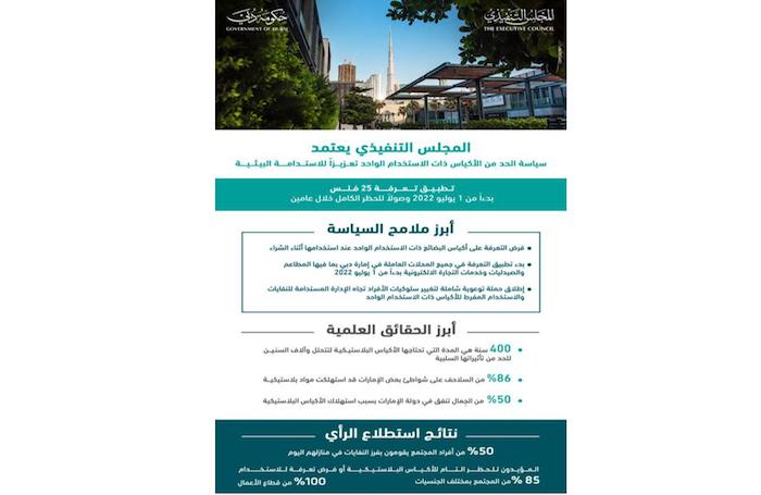 In line with enhancing environmental sustainability and encouraging individuals to reduce the excessive use of plastics, the Executive Council of Dubai has approved the policy to limit single-use bags by imposing a tariff of 25 fils on single-use bags used for carrying goods, starting from 1st July, 2022.