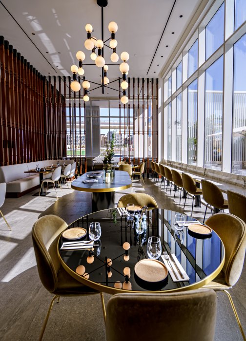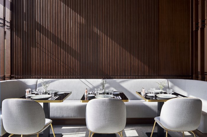 As you step into the lobby, the unique seamlessness between spaces stand out. The restaurant and lobby are separated by a screen of wooden slats rather than walls, encouraging guests to move freely between spaces and not feel enclosed within a particular area.