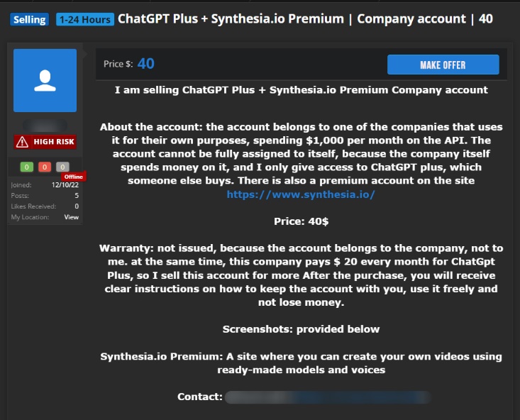 An example of dark web post offering access to ChatGPT and Synthesia corporate account for $40