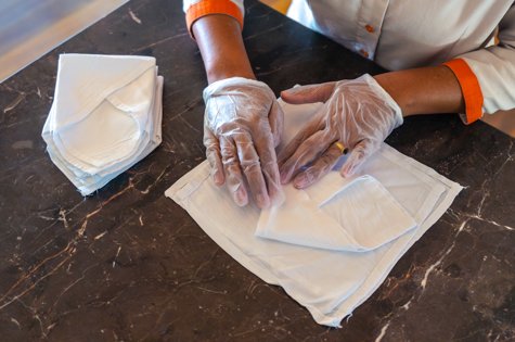 The step-by-step recycling process begins with the collection of damaged bed linens, which are then taken to the in-house tailor. Each king-sized bed sheet is carefully cut and crafted into approximately 60 pieces of 10x10 inch washcloths. The tailor cuts the bedsheet to 11x11 inches, folds an inch on each side, and stitches the edges to prevent fraying. This ensures that every piece of fabric is utilized to its fullest potential, with no chemicals involved – only a thorough washing before placement in the restrooms. The bed linens, due to their high absorbency, are ideal for this recycling process. The only equipment required is a sewing machine and the skilled hands of the tailor, making this initiative highly efficient and sustainable. To maintain health and safety standards, each outlet uses separate bags to carry fresh and soiled wash cloths, preventing cross-contamination. The laundry department uses an 8kg machine dedicated to washing these cloths, ensuring they meet hygiene standards before use.