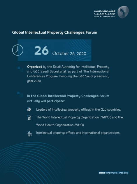 The Saudi Authority for Intellectual Property and the Saudi Secretariat for the G20 are organizing the Global Intellectual Property Challenges Forum on 3/9/1442 AH(10/26/2020 ) as part of The International Conferences Program, honoring the G20 Saudi presidency year 2020, as an initiative to respond to the priorities related to intellectual property in light of pandemics and global crises.