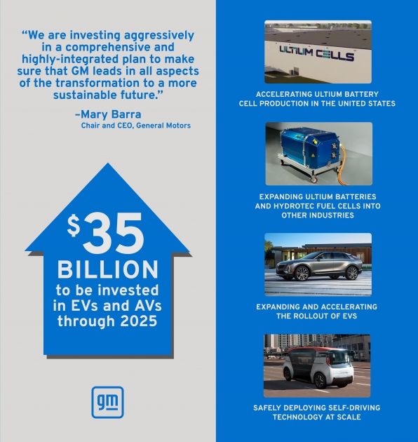 “We are investing aggressively in a comprehensive and highly-integrated plan to make sure that GM leads in all aspects of the transformation to a more sustainable future,” said GM Chair and CEO Mary Barra. “GM is targeting annual global EV sales of more than 1 million by 2025, and we are increasing our investment to scale faster because we see momentum building in the United States for electrification, along with customer demand for our product portfolio.”