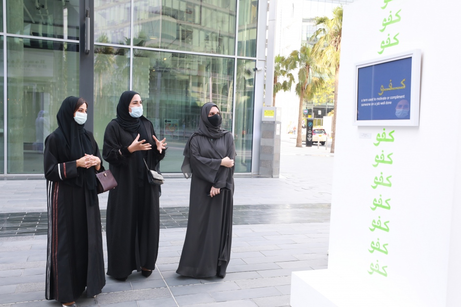 The Director General of "Dubai Culture" toured the exhibition that was held between buildings 6 and 7 in Dubai Design District, and in the "Personalities" section, she was briefed on the distinctive works of art created by Emirati artist Ahmed Al Mahri, a graphic designer specialized in collage, pop art and street art especially Arabic calligraffiti and stencil art. Al Mahri participated with illustrations depicting elements of modern Western culture projected on Gulf figures, in harmony with the theme of the exhibition, which focuses on highlighting aspects of the similarities between the Eastern and Western cultures.
