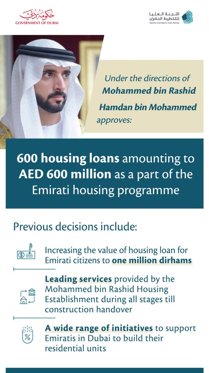 DUBAI, 3rd January, 2022 (WAM) -- Under the directives of His Highness Sheikh Mohammed bin Rashid Al Maktoum, Vice President, Prime Minister and Ruler of Dubai, H.H. Sheikh Hamdan bin Mohammed bin Rashid Al Maktoum, Crown Prince of Dubai and Chairman of Dubai Executive Council, has approved 600 housing loans worth a total of AED600 million to be provided by the Mohammed bin Rashid Housing Establishment as part of housing projects announced last year.