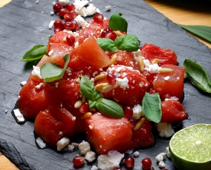 Watermelon is in season and at its absolute best right now, juicy, and when served chilled, extremely refreshing. The addition of crumbly feta cheese, pine nuts, lime, pomegranate and basil creates a well-rounded flavor and nutritional profile.